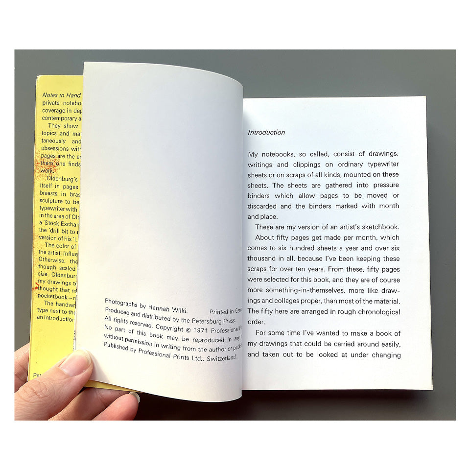 "'Notes in Hand' is a selection of fifty pages from the private notebooks of Claes Oldenburg – the first coverage in depth of these important documents of contemporary art. They show Oldenburg’s mind at work on any topics and materials which come his way, spontaneously and playfully mixing his personal obsessions with the stuff of daily life. These notepages are the artist’s version of a sketchbook and in them one finds the original impulses to his larger work.”