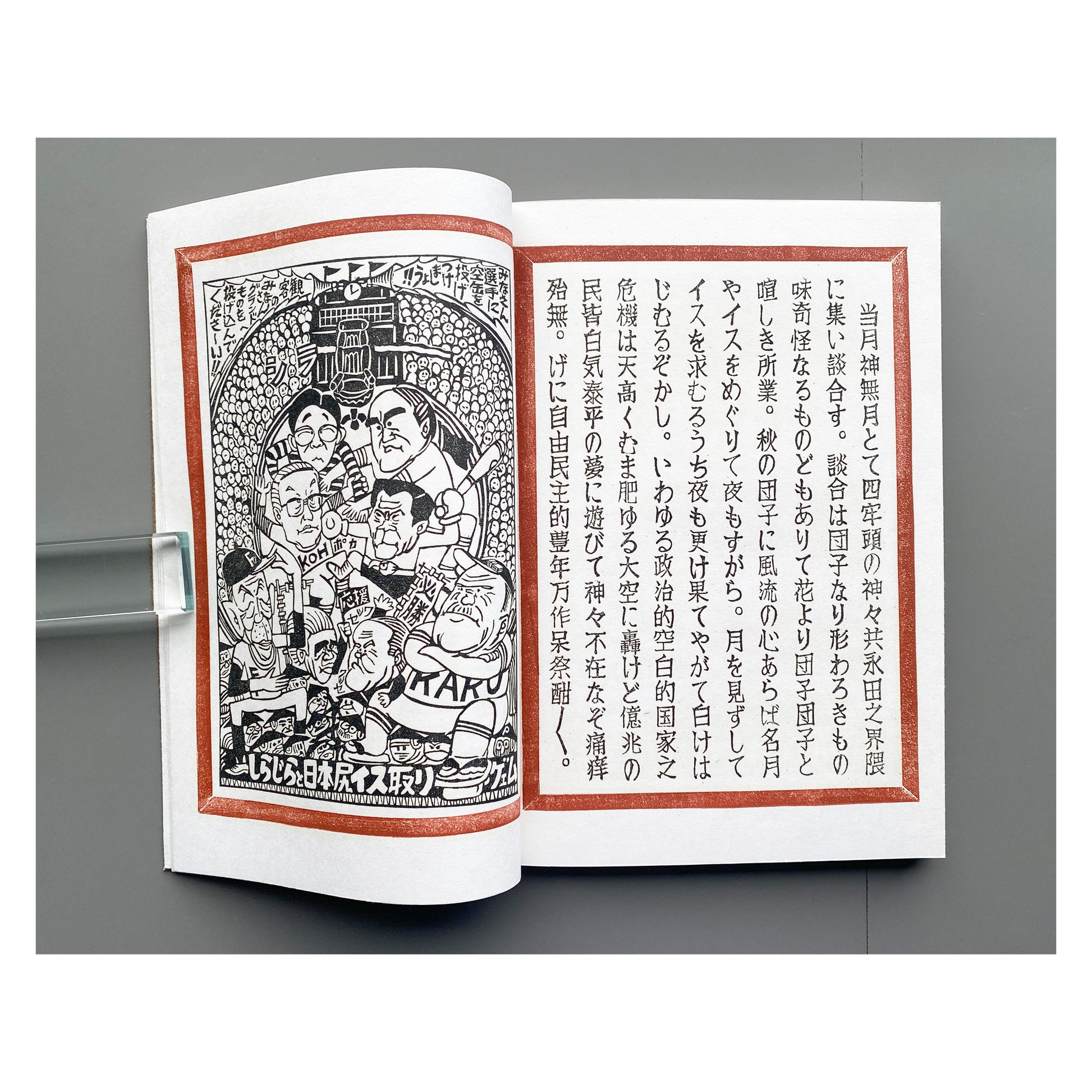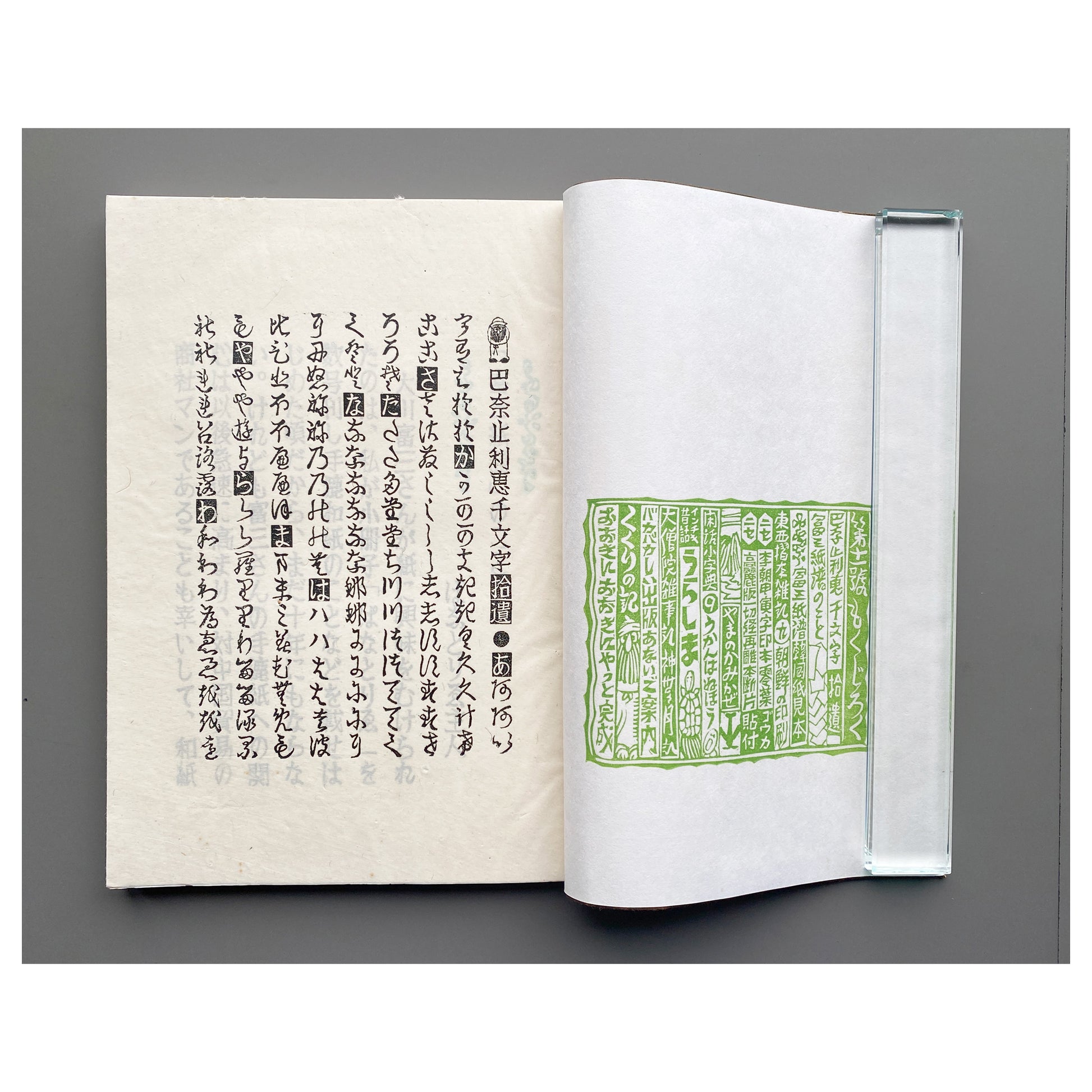 美術家・美術教師の山口汎一(1939–1988)によって制作された私家版《ぱなとりゑ》シリーズは、和綴を基調とした特徴的な装丁に加え、社会風刺、言葉遊び、仏像巡りなど、多岐にわたる主題を自在に横断する。刷られた活字はすべて作家自身が手作業で彫刻したものであり、本文中の図版は写真や版画を切り貼りすることで構成されている。使用される和紙の質感もシリーズごとに異なり、本という媒体が本来備える原初的なおもしろさを強く感じさせる。ページを繰るたびに、その手触りがふたたび恋しくなる作品である。