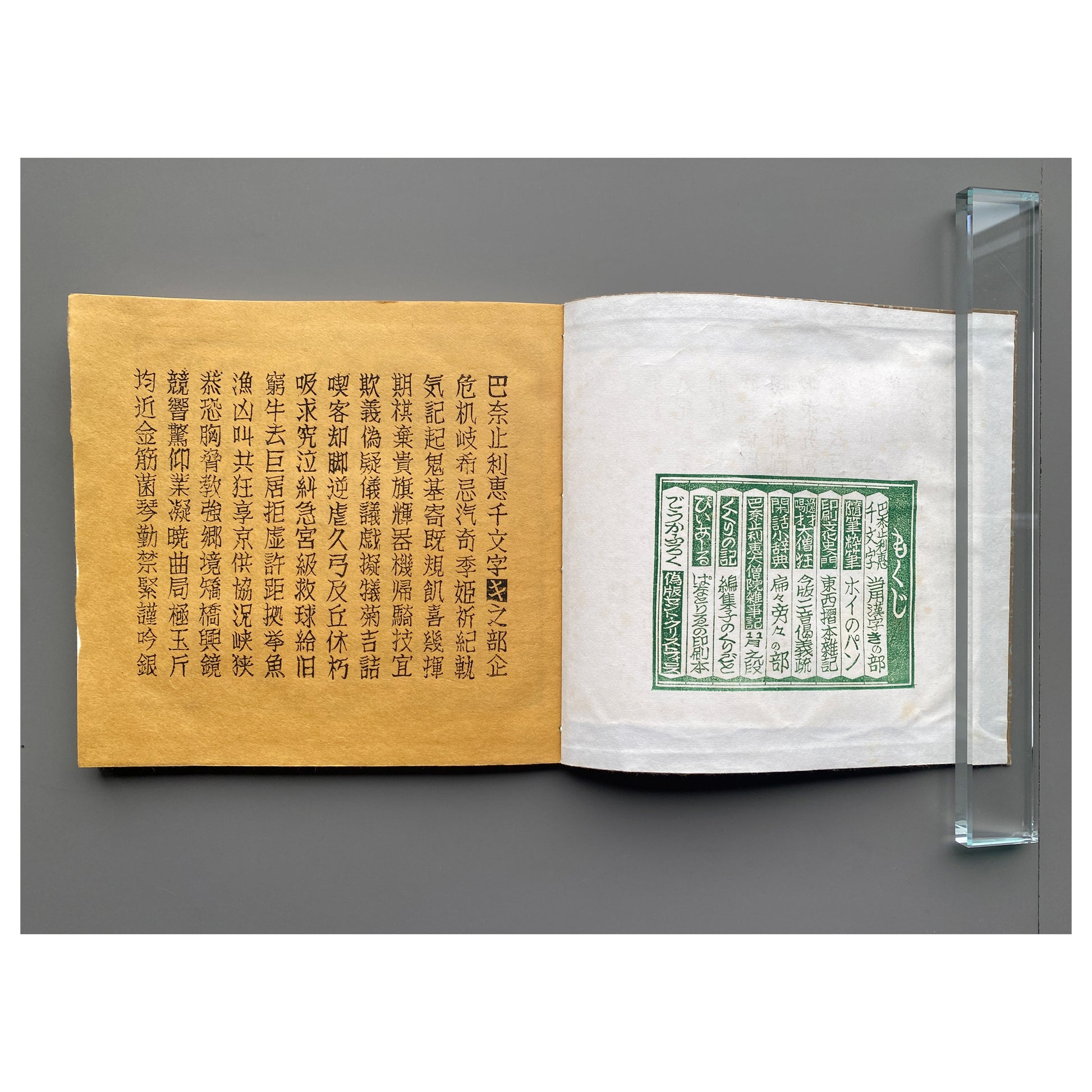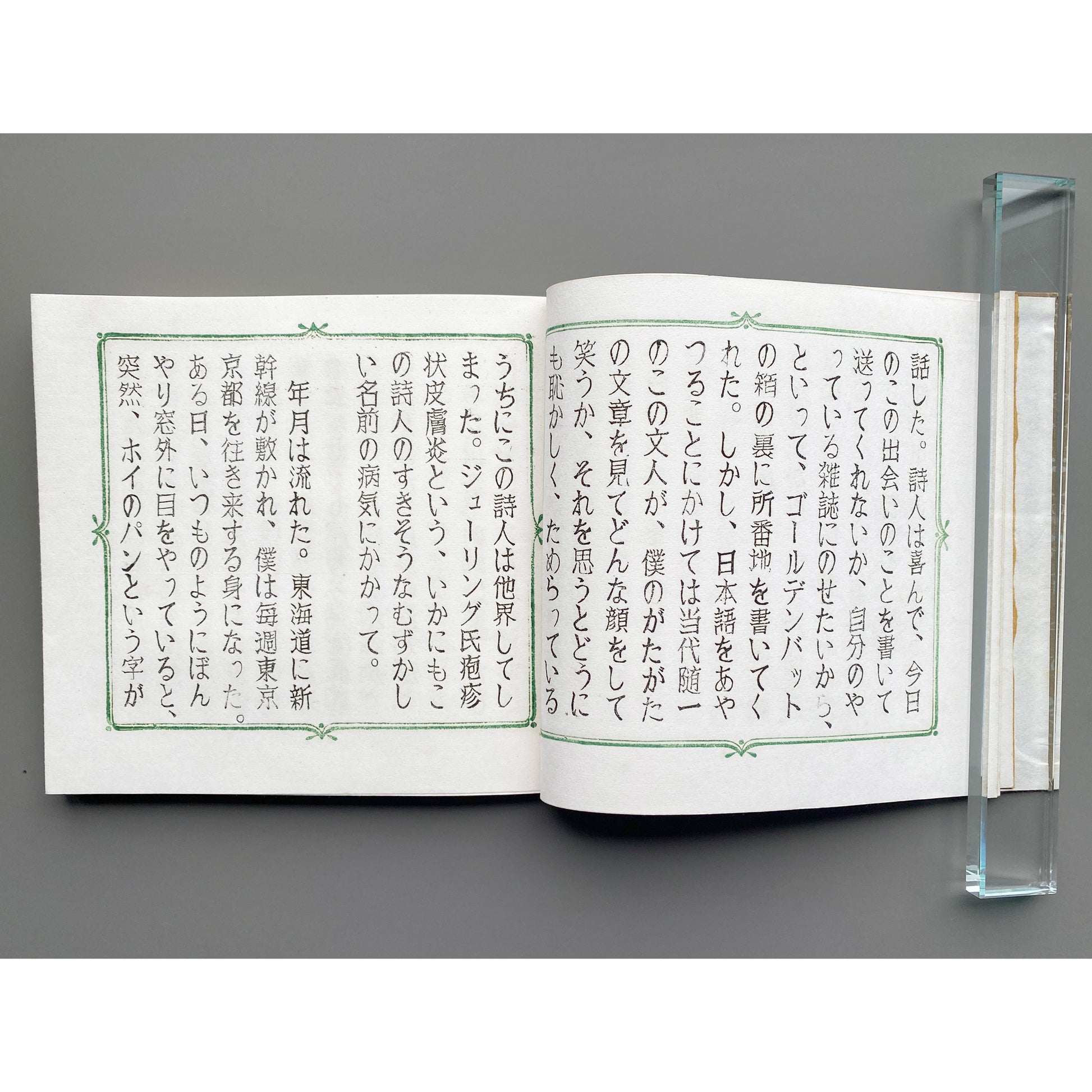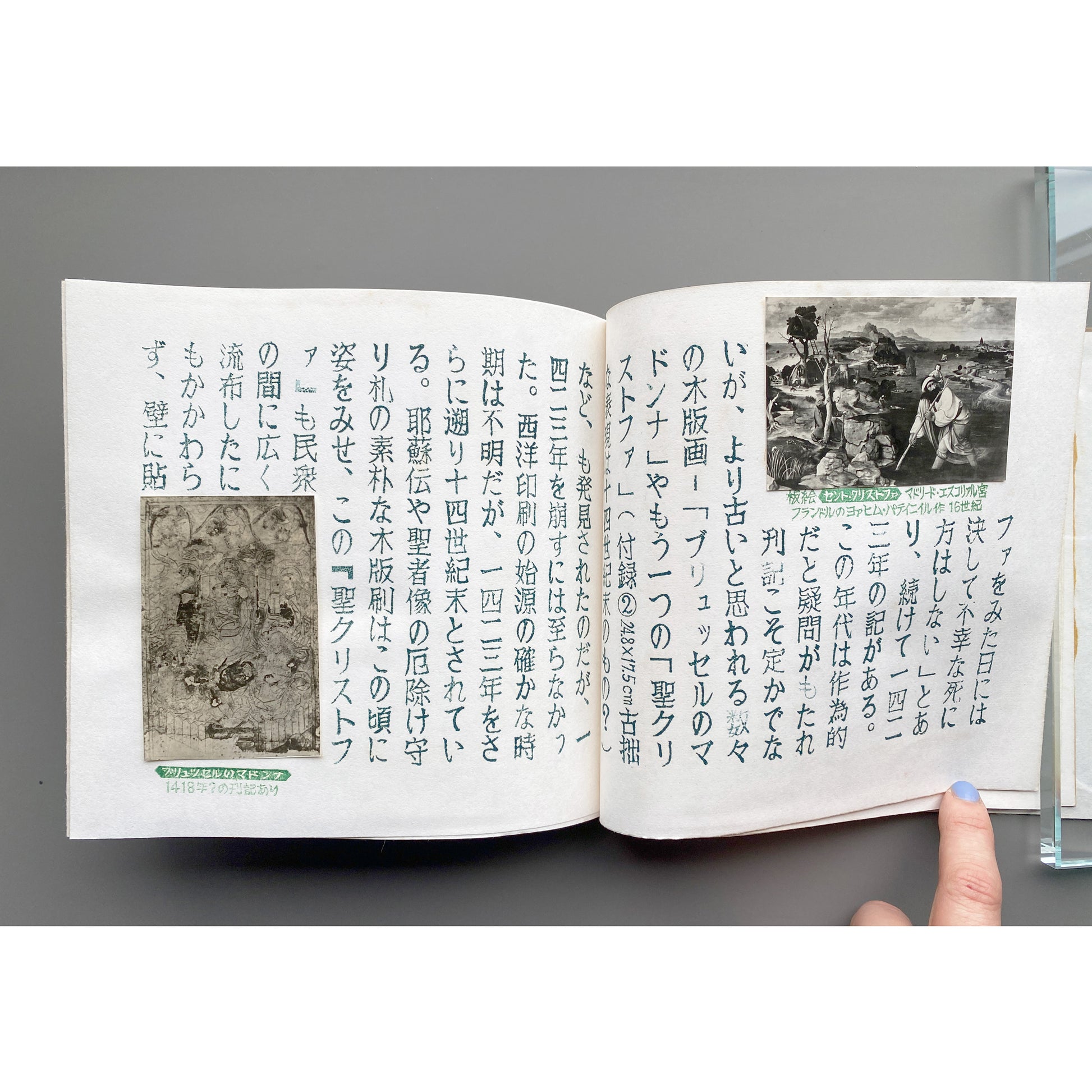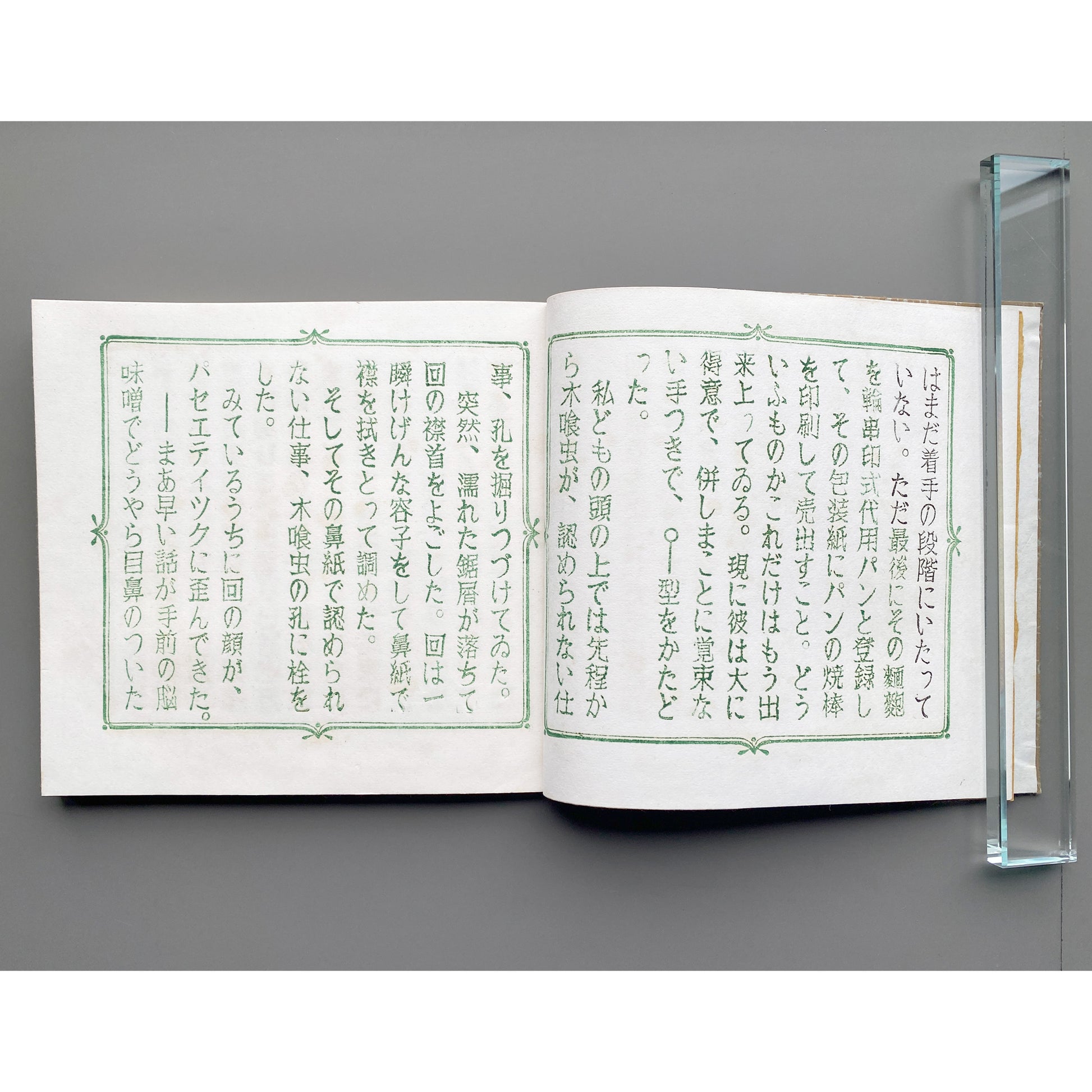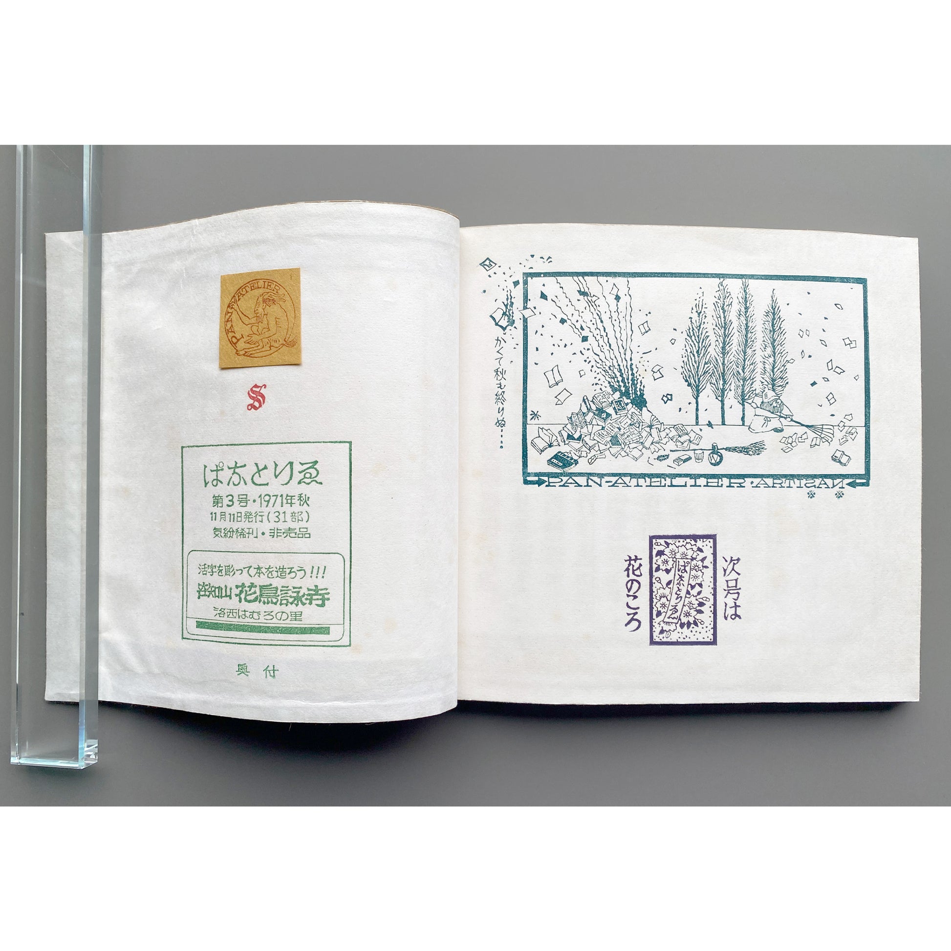 美術家・美術教師の山口汎一(1939–1988)によって制作された私家版《ぱなとりゑ》シリーズは、和綴を基調とした特徴的な装丁に加え、社会風刺、言葉遊び、仏像巡りなど、多岐にわたる主題を自在に横断する。刷られた活字はすべて作家自身が手作業で彫刻したものであり、本文中の図版は写真や版画を切り貼りすることで構成されている。使用される和紙の質感もシリーズごとに異なり、本という媒体が本来備える原初的なおもしろさを強く感じさせる。ページを繰るたびに、その手触りがふたたび恋しくなる作品である。