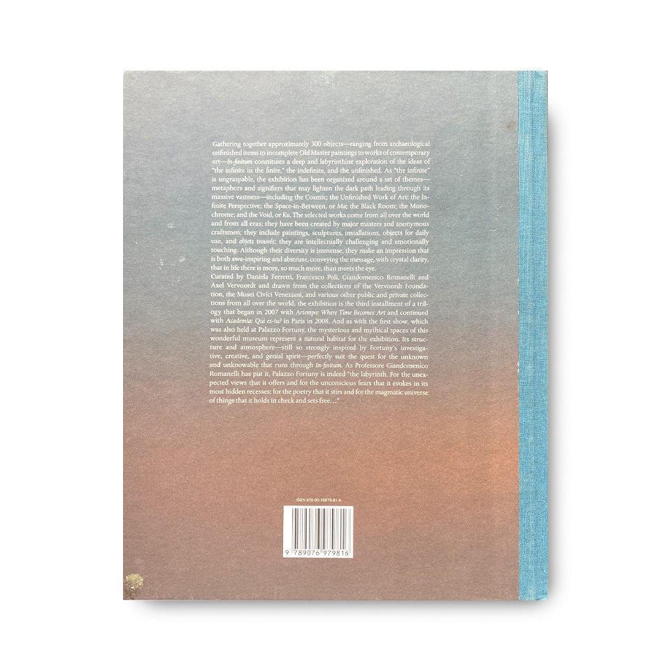 「In-Finitum」は、2007年に『アートテンポ:時が芸術となる』で始まり、2008年にパリで『アカデミア:キ・エ・トゥ?』と続く三部作の第三弾である。ヴェネツィアのパラッツォ・フォルトゥーニの4階層に約300点の作品を展示。考古学的未完成品から未完の巨匠絵画、無限を捉えた現代インスタレーションまで、芸術作品は多岐にわたる。哲学者、神学者、数学者、物理学者、詩人、作家、芸術家が歴史を通じて試みてきたように、無限の神秘に迫ろうとすることは、不確定、絶対、計り知れないものの総和、言葉に尽くせぬもの、膨大、宇宙的、極微、超限、極限、神聖、 無、虚無。ラテン語のinfinitumはハイフンでin-finitumと分割され、「有限の中の無限」や不定、未完成といったより複雑で問題を含む解釈を示唆している。」(出版社より)